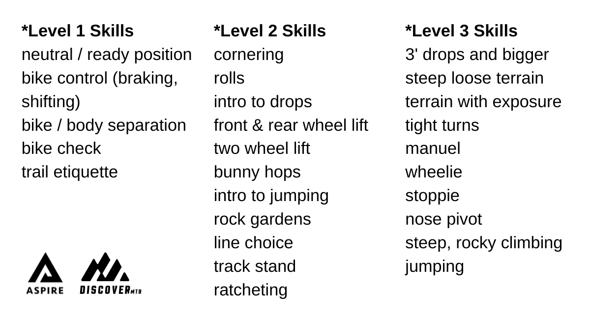 If you do not have experience mountain biking we ask you to reach out to us before registering for Aspire MTB so we can make sure you have the fundamental skills necessary to have the best experience possible.